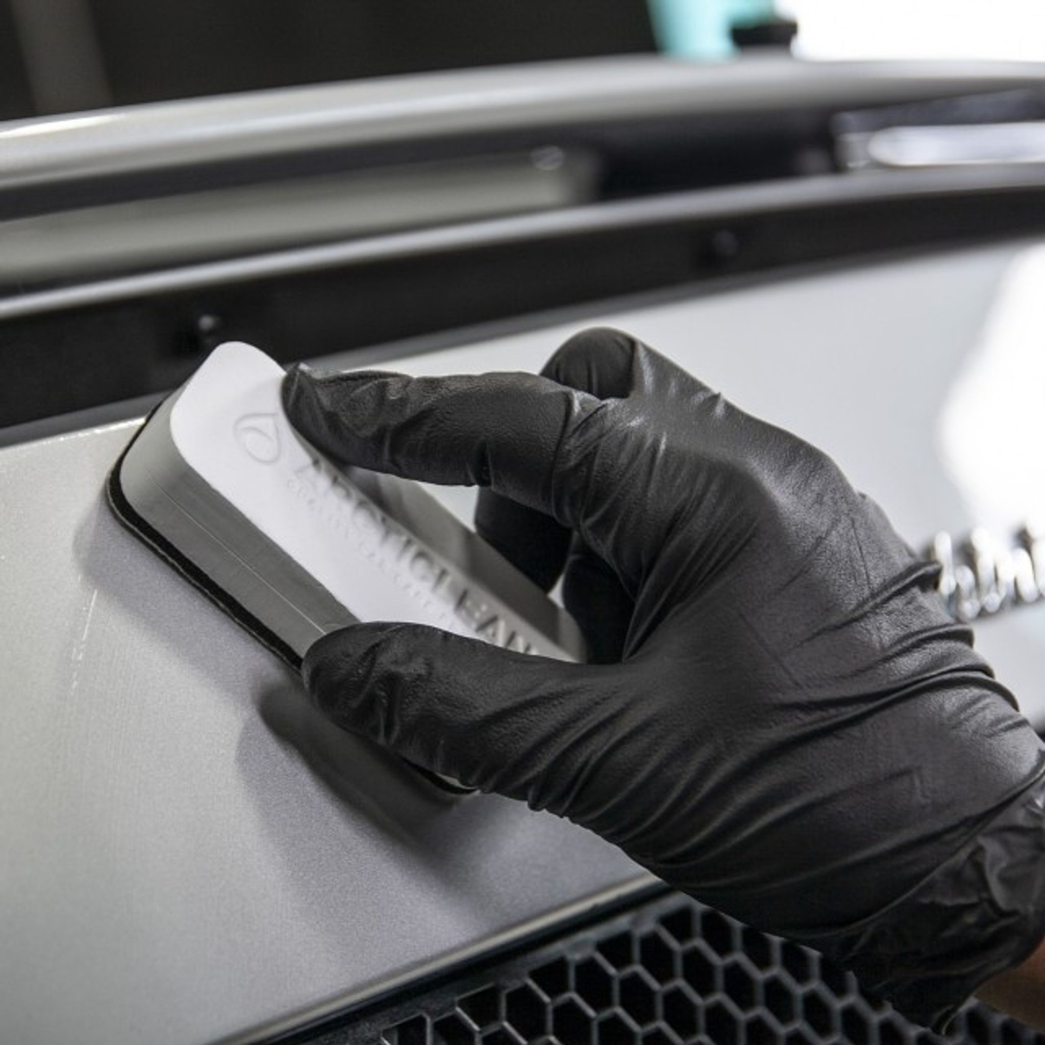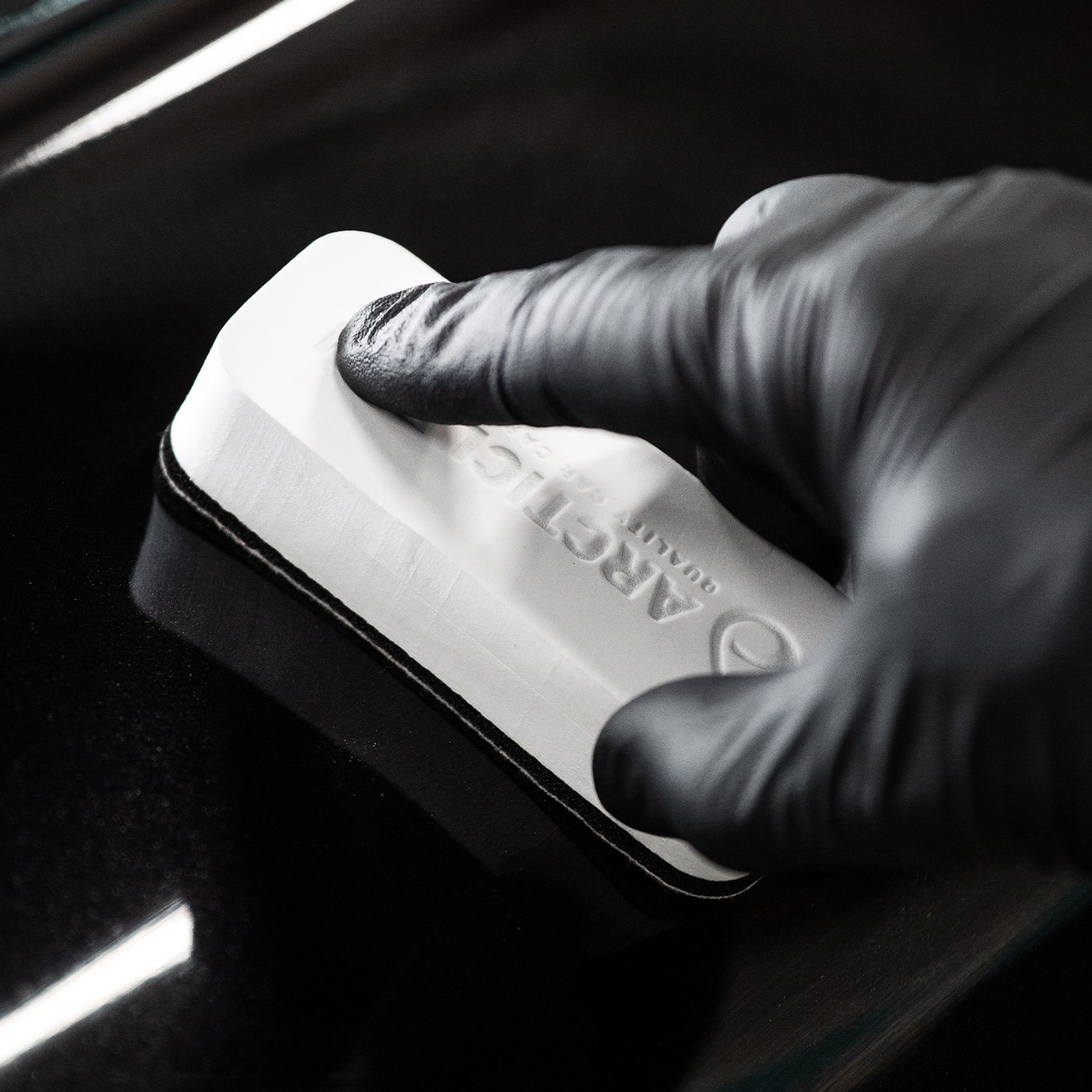Skumgummiapplikator för att applicera keramisk coating. Svampen har en stängd skumkärna för att inte suga upp överflödig coating. Ytterligare ett lager poröst skum och ytterst en microfiberyta.