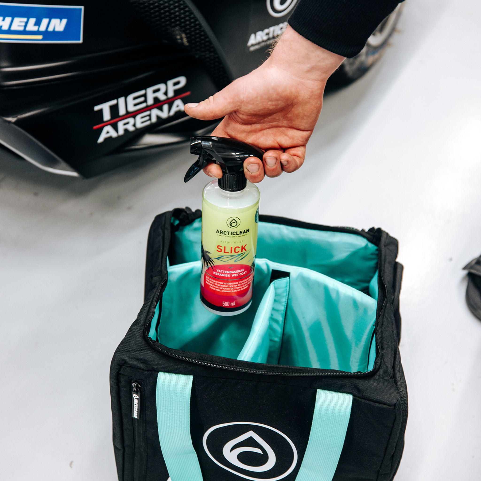 Arcticleans detailing bag håller dina favoriter samlade – från flaskor och borstar till mikrofiberdukar.