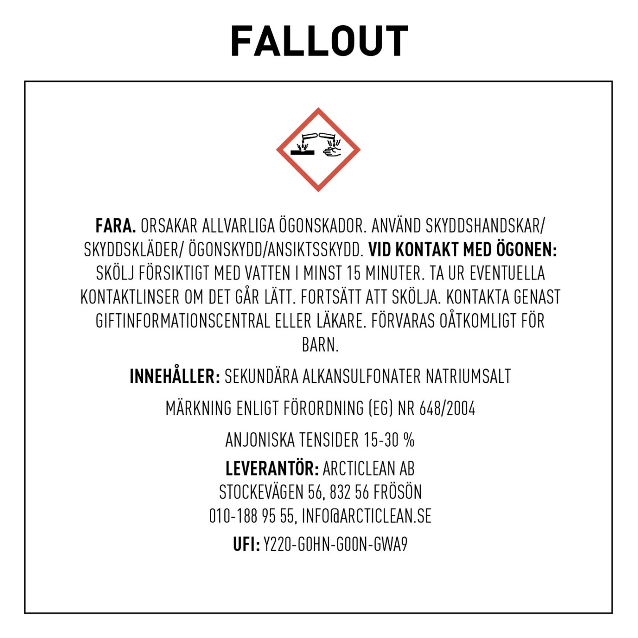 VARNING. Skadligt vid förtäring. Kan orsaka allergisk hudreaktion. Förvaras oåtkomligt för barn. Undvik att inandas dimma/ångor. Använd ögonskydd/skyddshandskar. VID HUDKONTAKT: Tvätta med mycket vatten/vatten och tvål. Vid hudirritation eller utslag: Sök läkarhjälp. Innehållet/behållaren lämnas till en godkänd avfallsanläggning. TÖMD/ DROPPFRI FÖRPACKNING SORTERAS SOM HÅRDPLAST. Innehåller: < 5% Anjontensider; Parfym (D-LIMONENE); Sodium mercaptoacetate. LEVERANTÖR: ARCTICLEAN ABSTOCKEVÄGEN 56, 832 56 FRÖSÖN010-188 95 55, INFO@ARCTICLEAN.SE