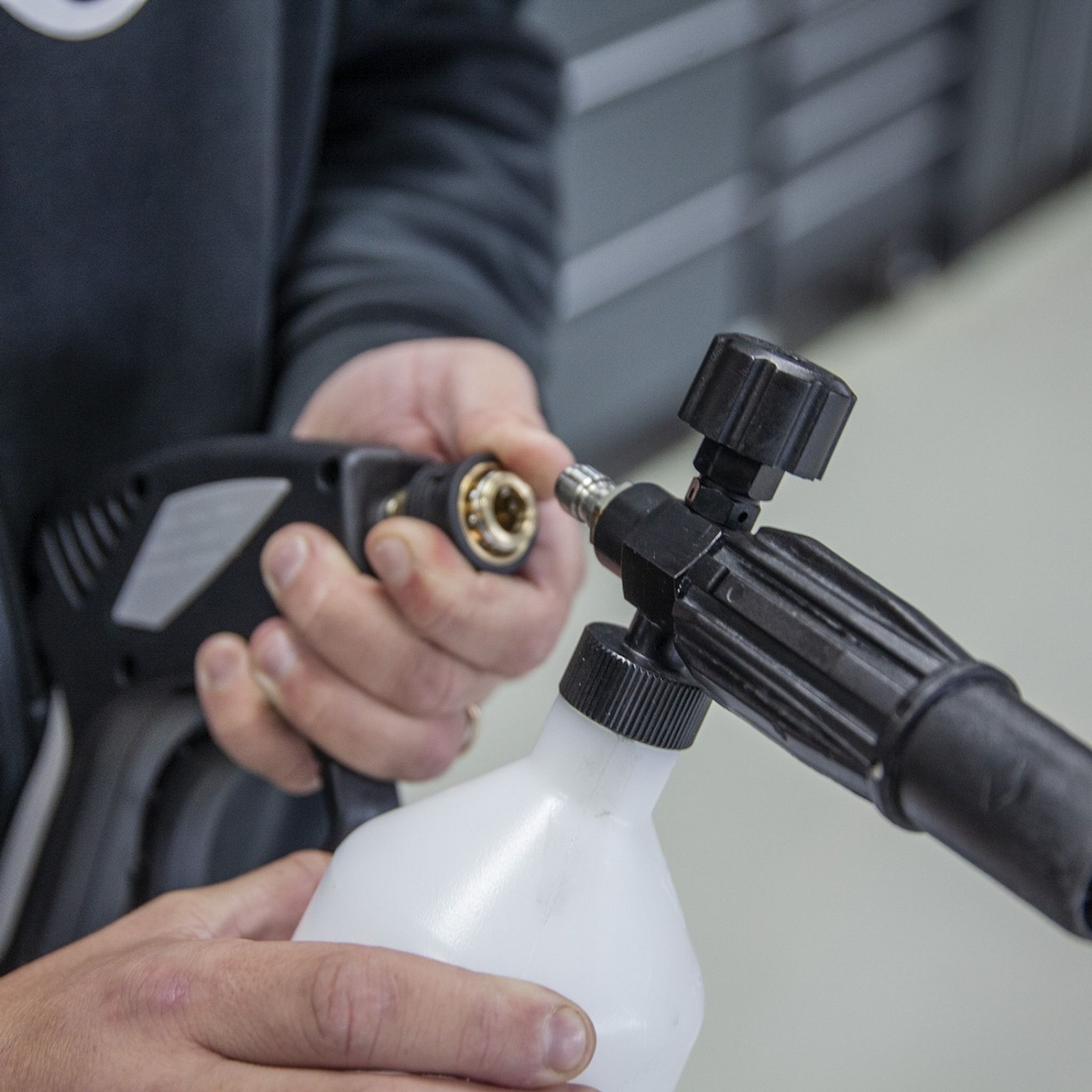 Långa spollansar är sällan någon fördel, snarare tvärt om när man tvättar personbilar. Snabbkopplingen gör att det går extremt fort att byta mellan olika tillbehör som Foam lance eller olika spolmunstycken.