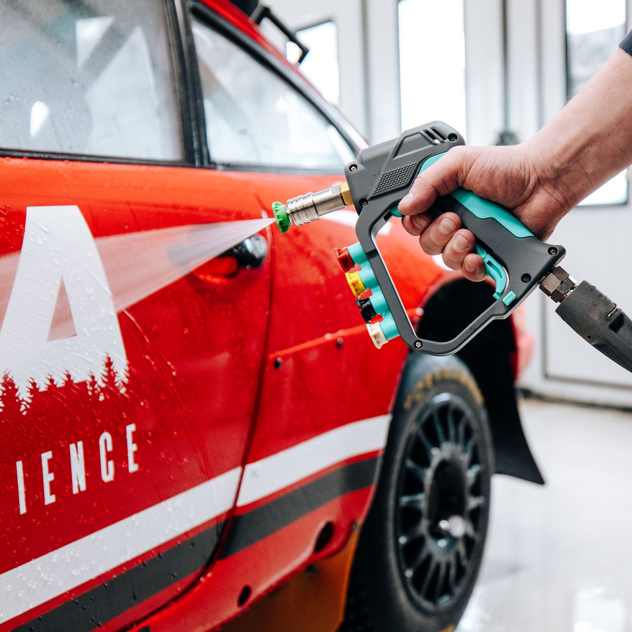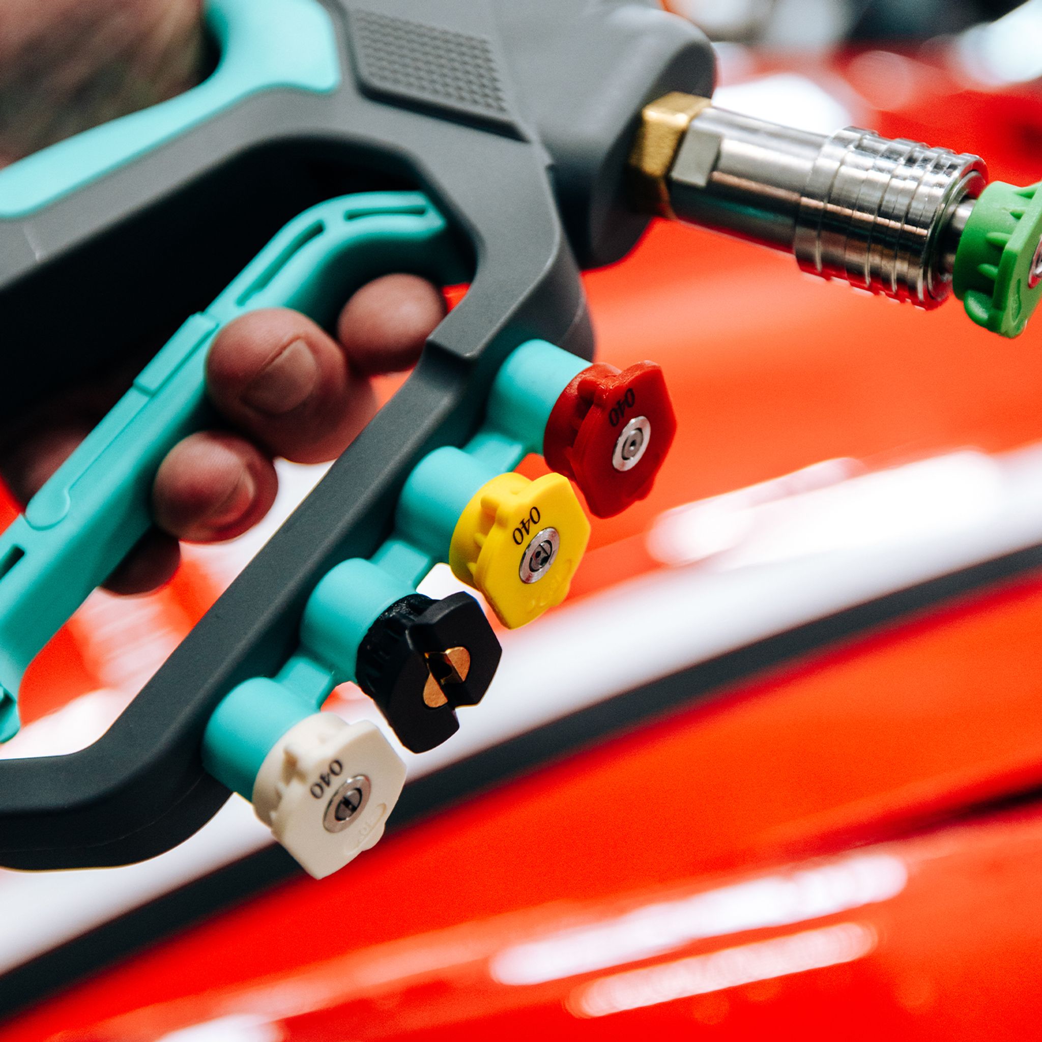 Svivel som förhindrar slangtrassel. “Quick connect för att snabbt byta mellan tillbehör och de 5 olika snabbmunstyckena. Perfect match tillsammans med foam lance.