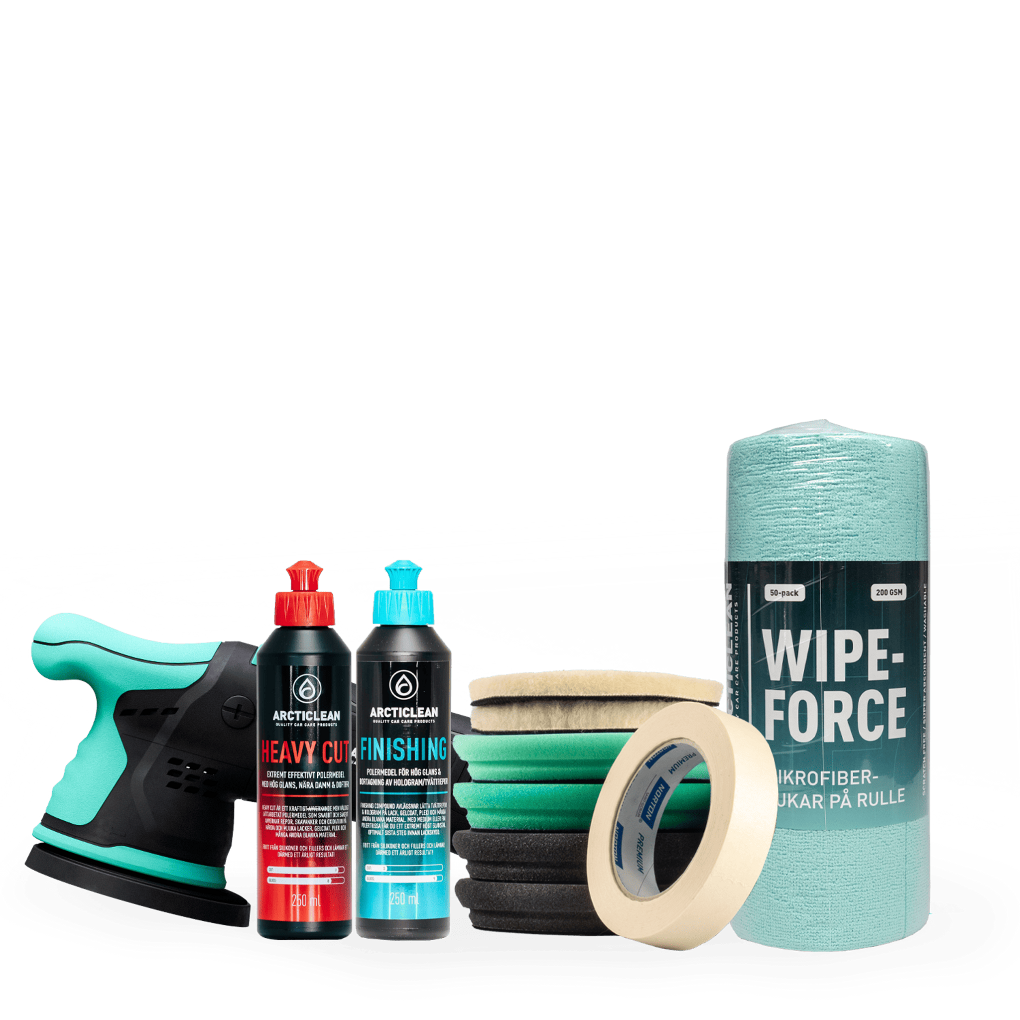 I det här paketet så följer det med rena polermedel. Efter poleringen rekommenderar vi att du antingen lägger vårt keramiska skydd Base + top coat - kit, Hybrid wax eller Speed coat. Om du inte har planer på att lägga ett skydd efter poleringen så rekommenderar vi att du köper till Polish &amp sealant och kör det istället för Finishing compound så får du ett bra lackskydd direkt av poleringen.