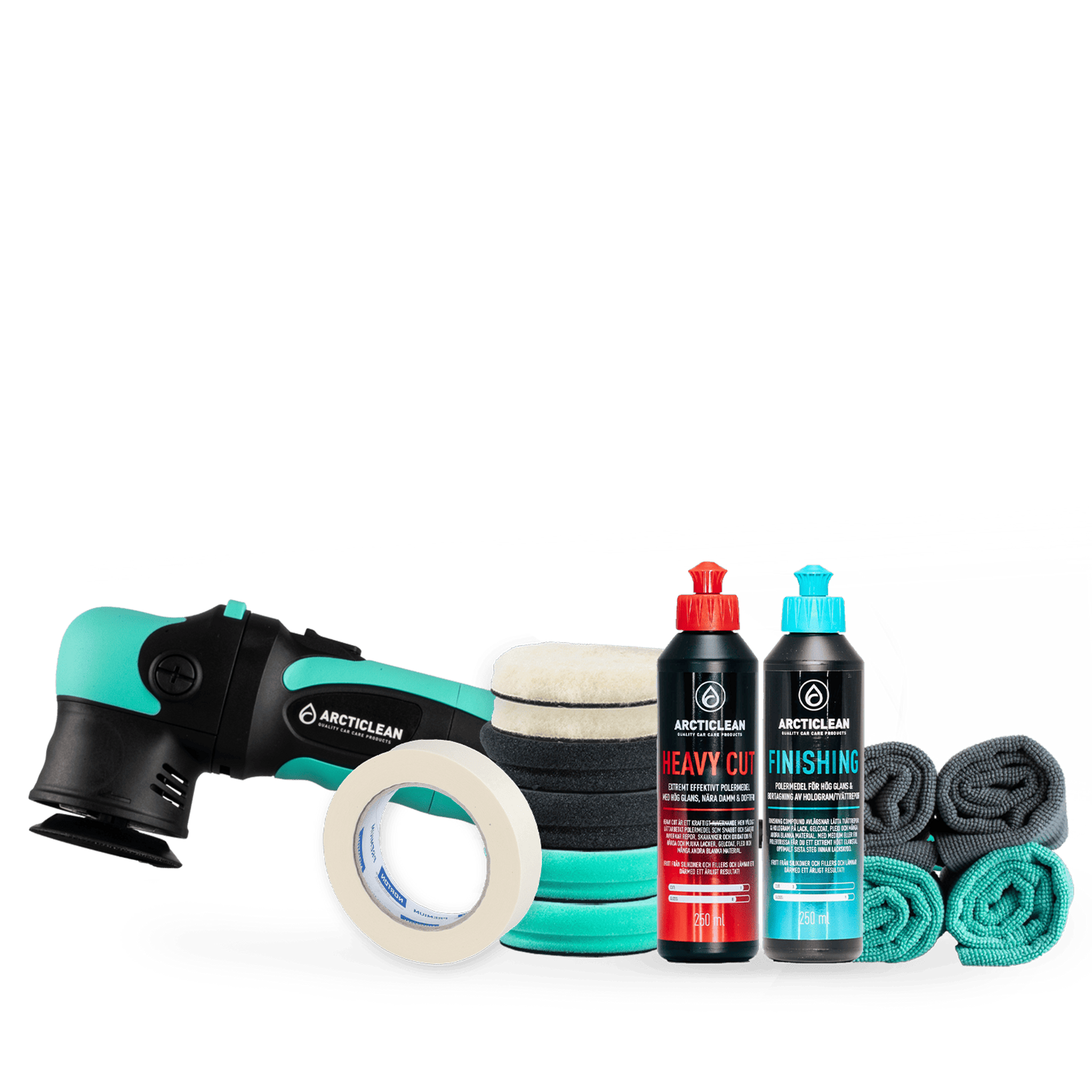 I paketet ingår våra mest beprövade polermedel. Efter avslutad polering rekommenderar vi att du applicerar ett skydd som exempelvis vårt keramiska lackskydd Base + Top Coat – kit, Hybrid Wax eller Speed Coat. Om du hellre vill slå två flugor i en smäll kan du byta ut Finishing Compound mot Polish & Sealant – då får du både glans och skydd i ett och samma steg.