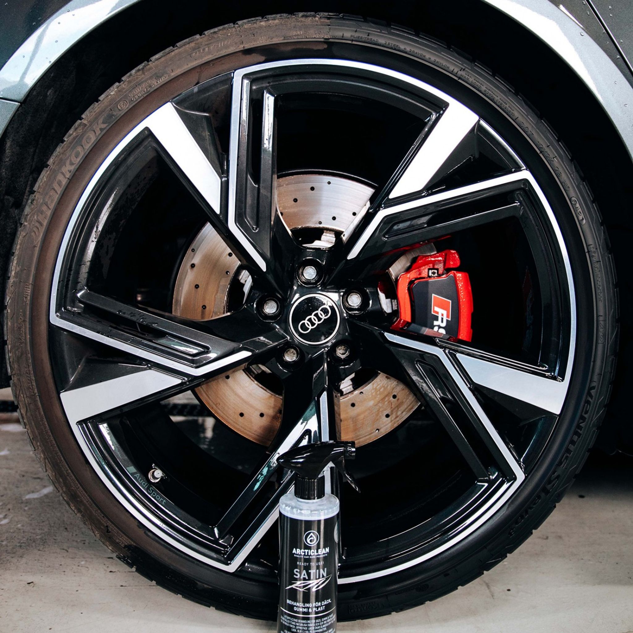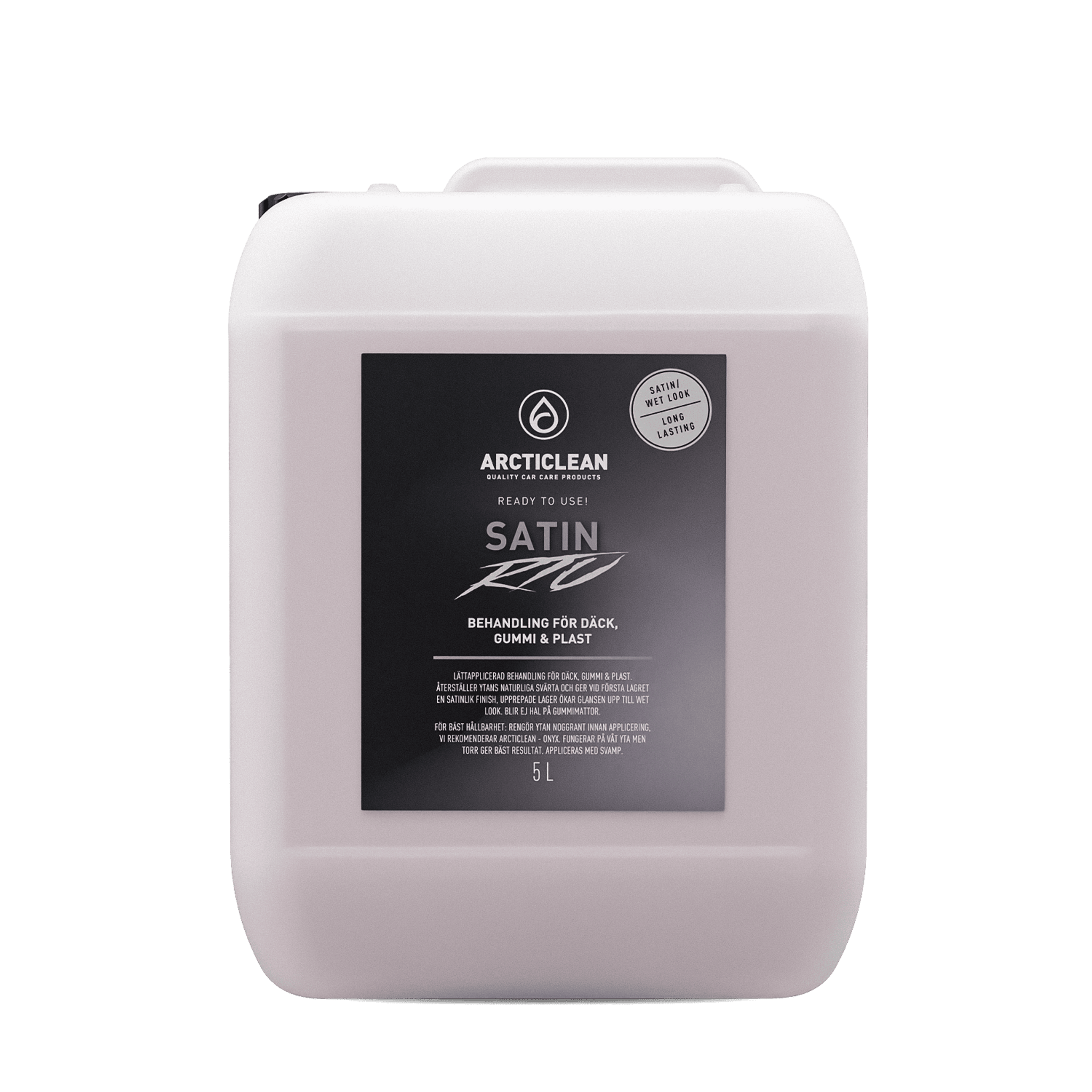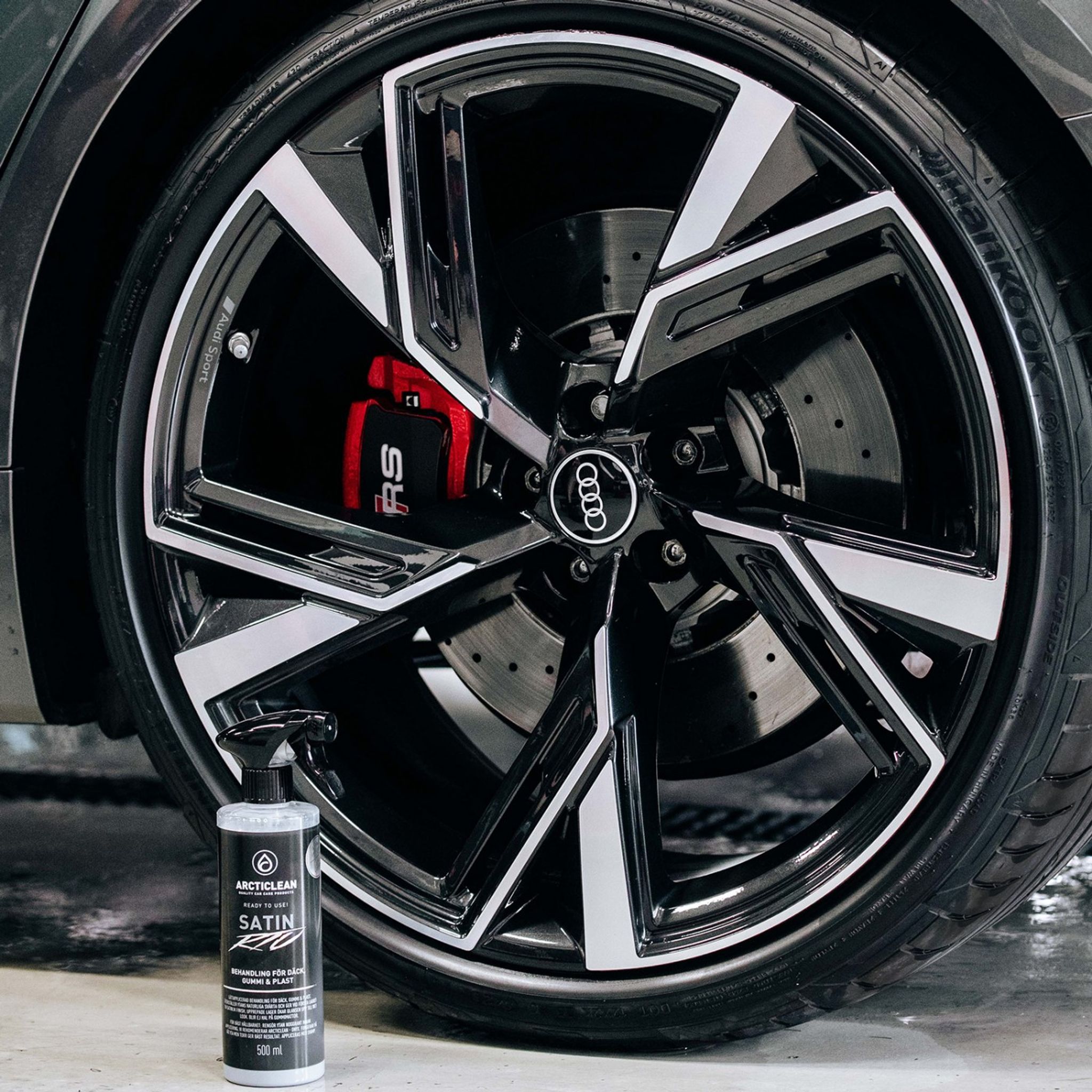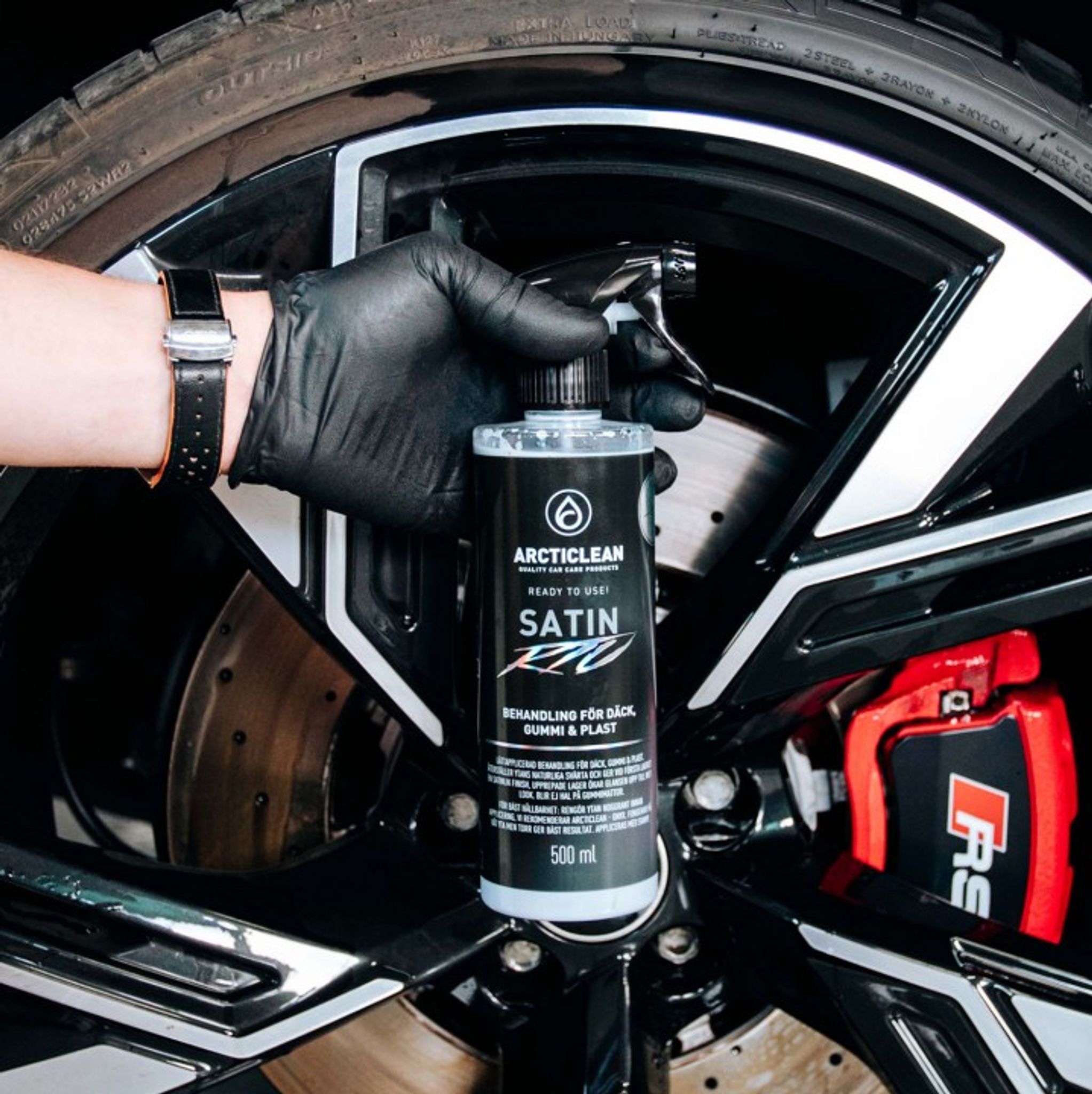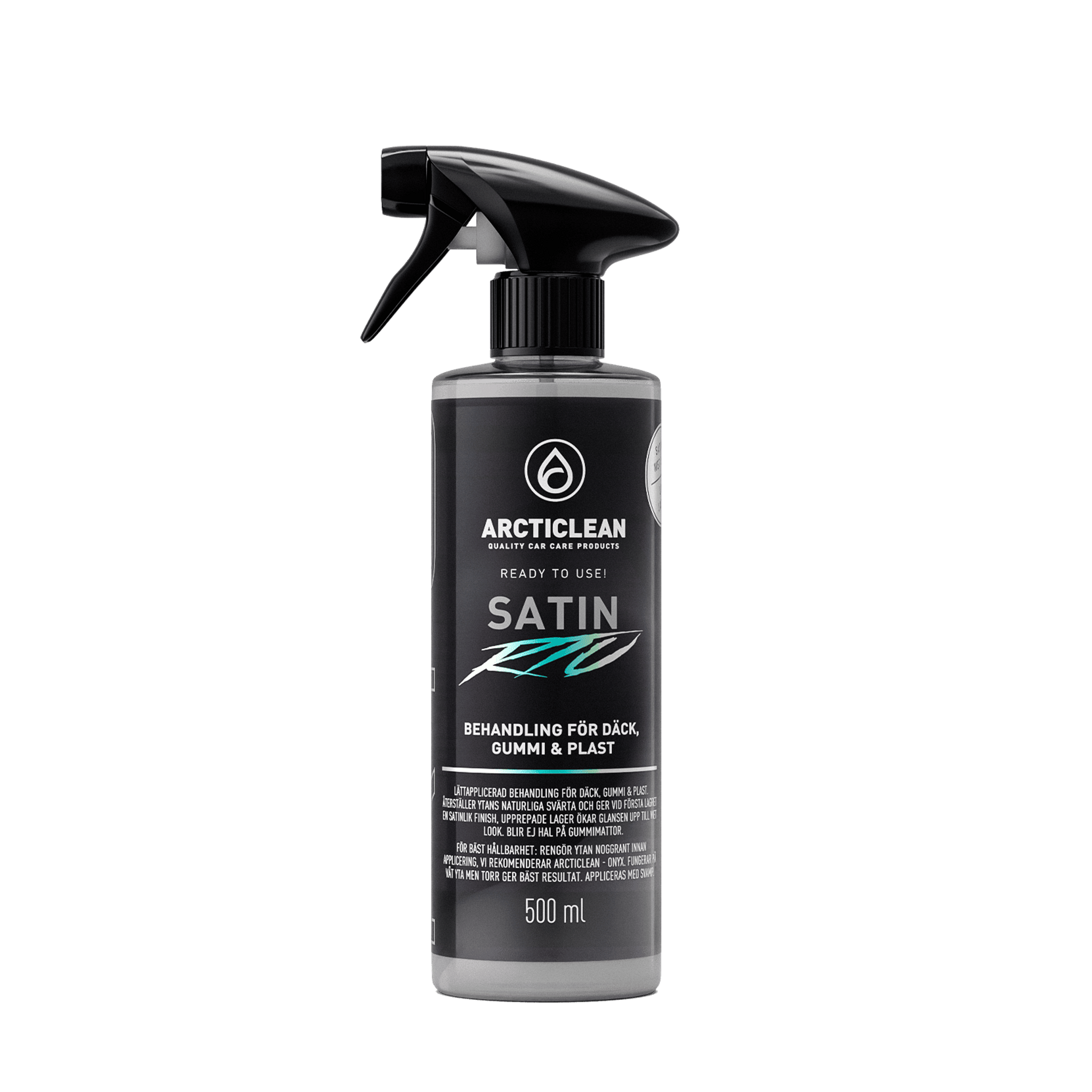 Satin är vår nya keramiska behandling för däck, gummi och plast. Väldigt lätt att lägga och återställer ytans naturliga svärta och ger vid första lagret en satinlik “orginal” finish, Upprepar man kan man få en blankare yta med mer wetlook.