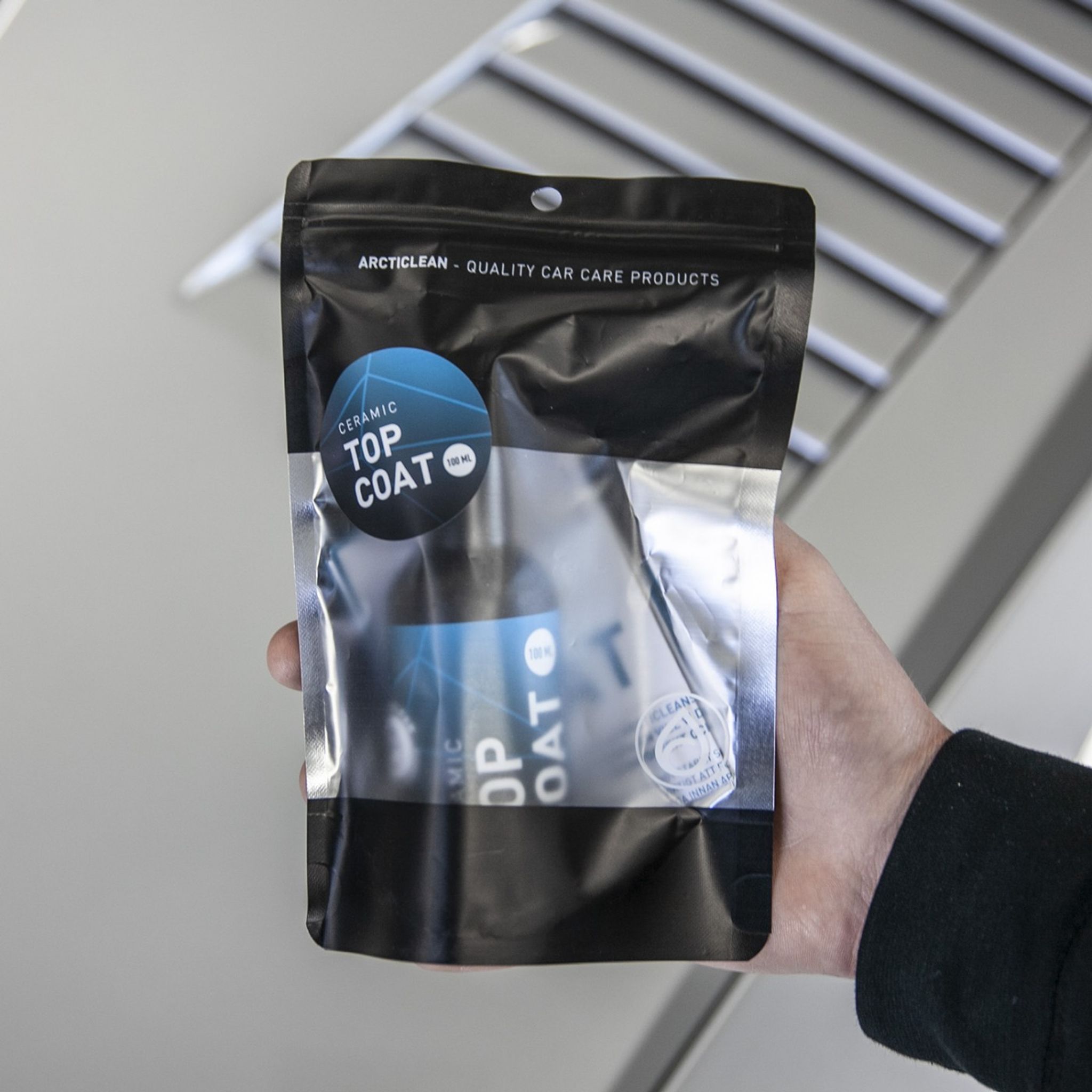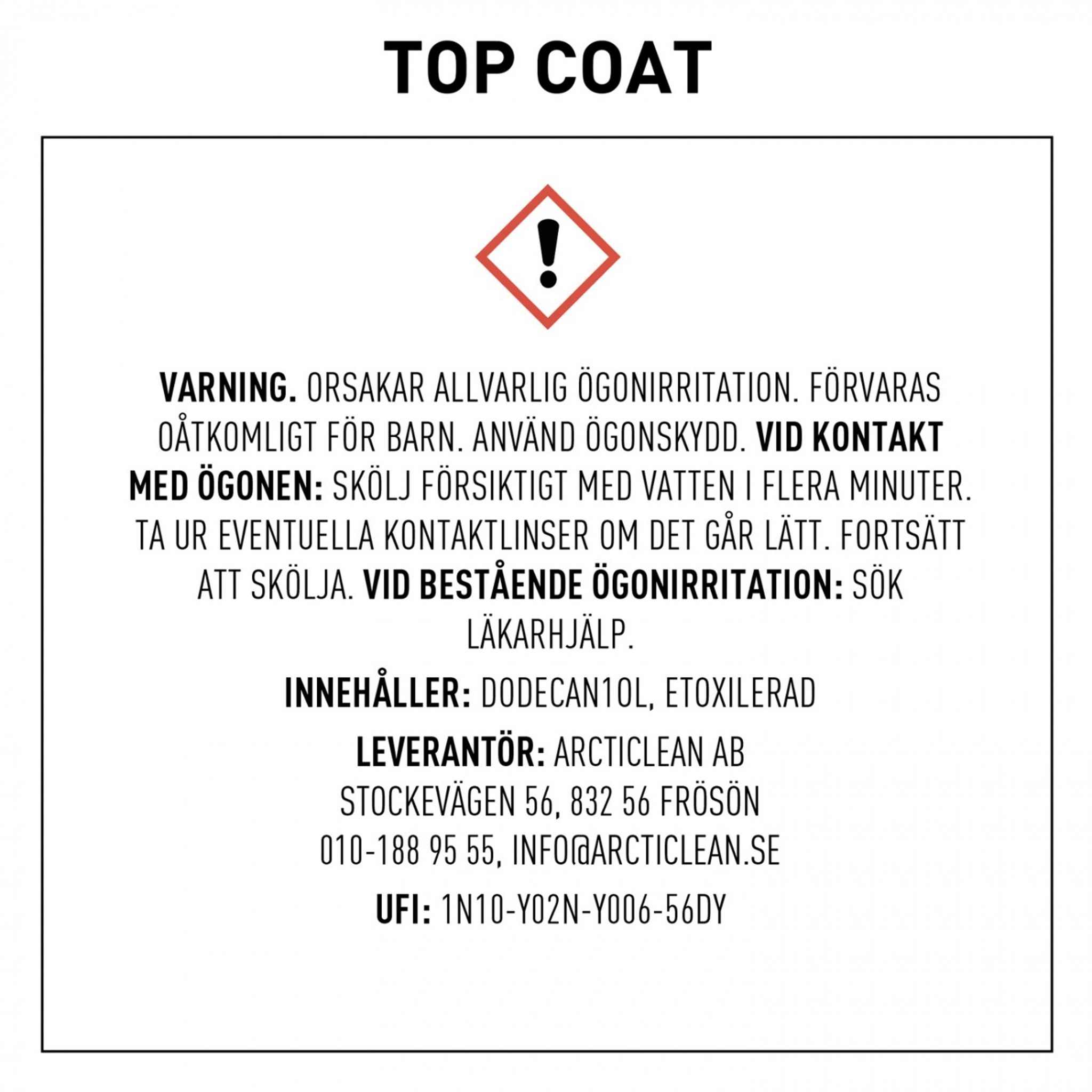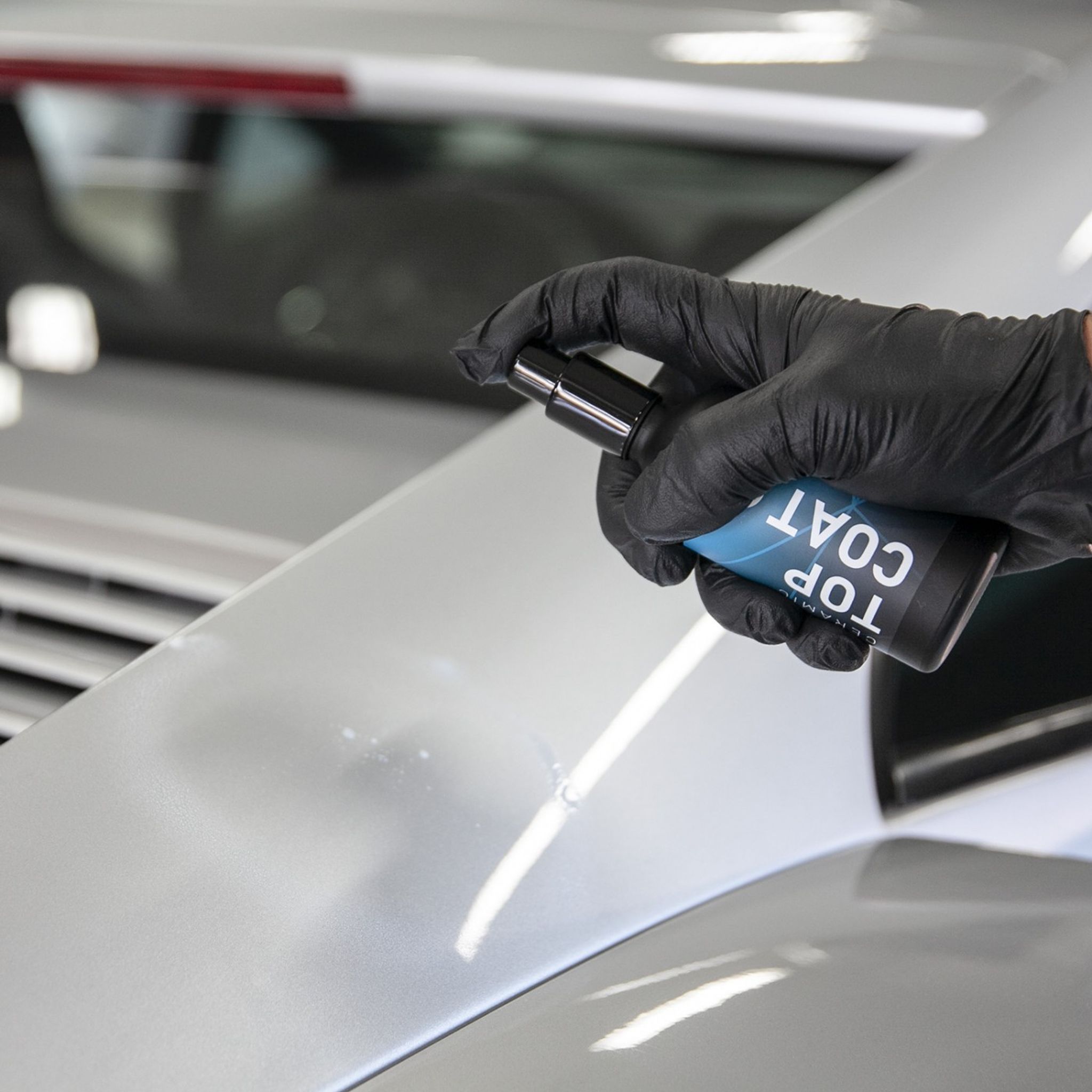 Top coat fungerar som namnet tyder på, en top coat, det vill säga ett sista lager efter att man lagt Base coat. Men även som ett riktigt schysst enstegsskydd som ger en en extrem hydrofobisk (vattenavvisande effekt) och ett väldigt högt glanstal med ett varaktigt skydd som normalt har en hållbarhet upp till ett år och kan bättras på utan risk för krackelering etc.