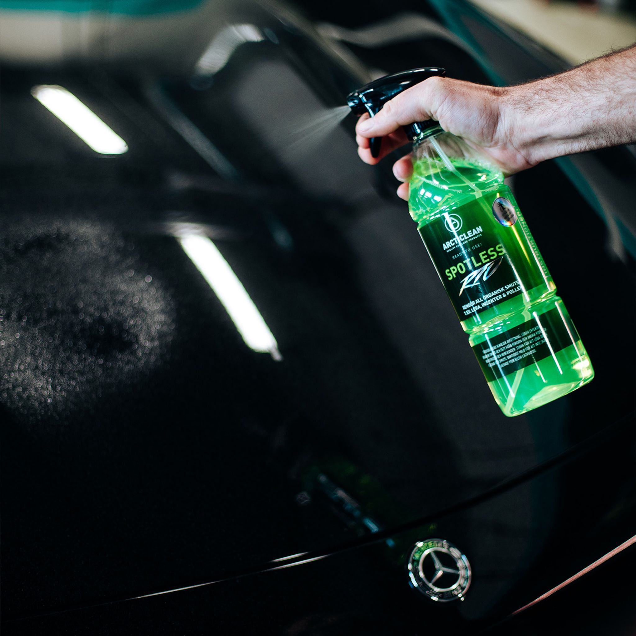 - Utan att ha spolat av bilen, spraya på Spotless. Spotless är en alkalisk avfettning löser organisk smuts.