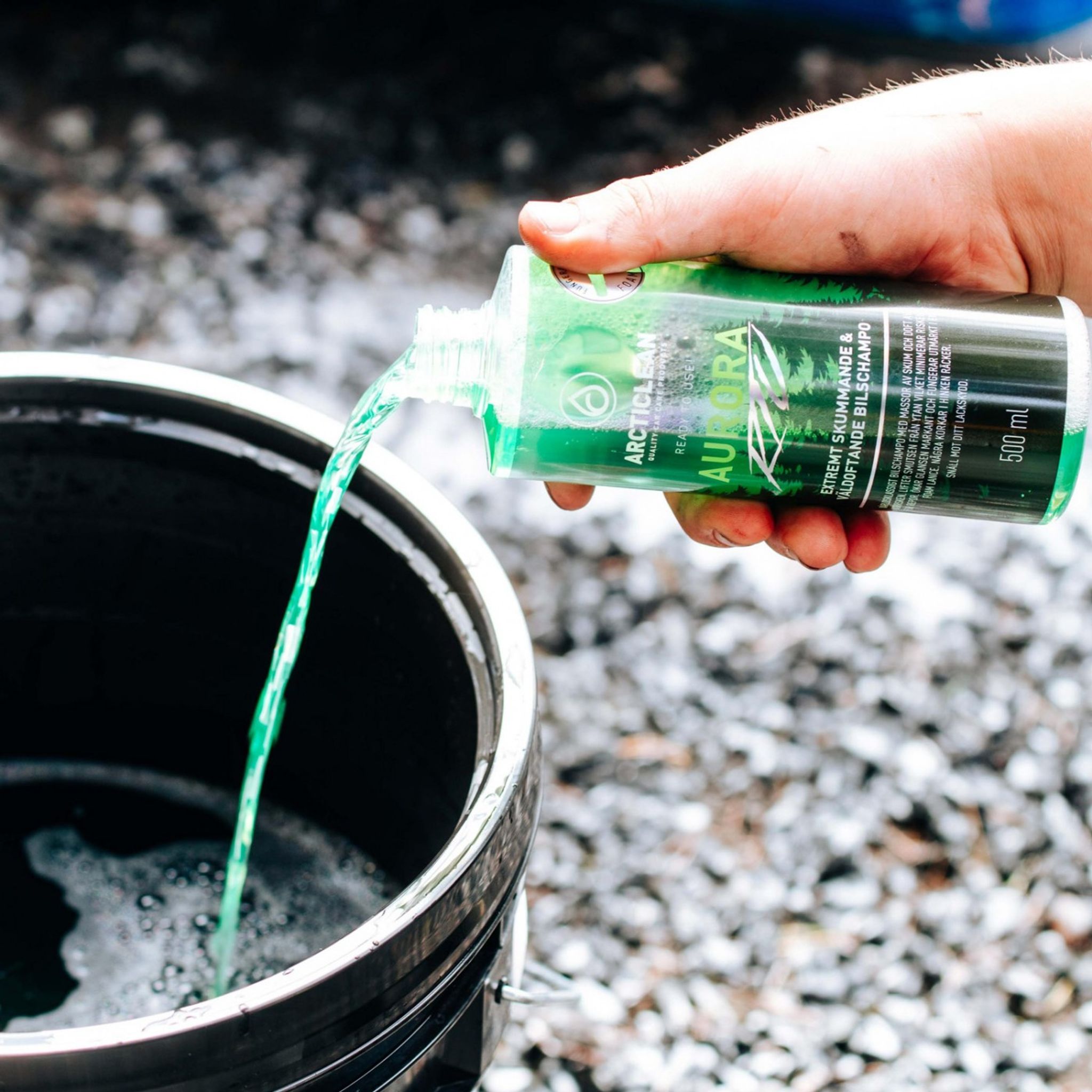 - Om du tvättar ofta så kan du vid det här laget ha en helt ren bil utan att ens ha gått på med en tvättsvamp men speciellt under vintertid så är det stor risk för att du har en trafikfilm kvar på bilen, men vid det här laget så har du tvättat bort all grövre smuts och det är helt säkert att gå på med en svamp. Alltså är det dags att spola upp en hink med vatten och svampa bilen tillsammans med Aurora. När du har svampat bilen så spolar du av en sista gång.